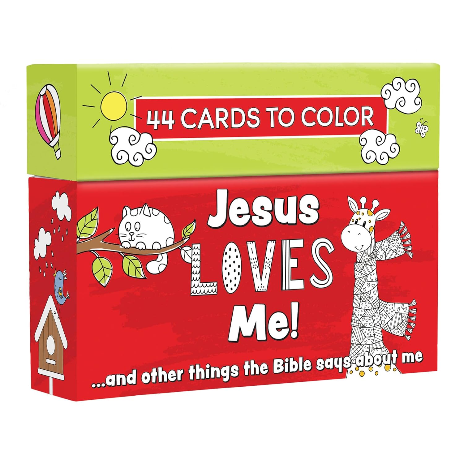 The box contains 44 cards made from heavy cardstock. Each card features a heartwarming, biblically based affirmation—showing children that they are loved, forgiven, saved, chosen, and strengthened by Jesus. These affirmations are supported by uplifting Scripture verses and paired with a fun line-art illustration, ready to be colored. The backs are intentionally left blank for children to add their own insights or drawings.
