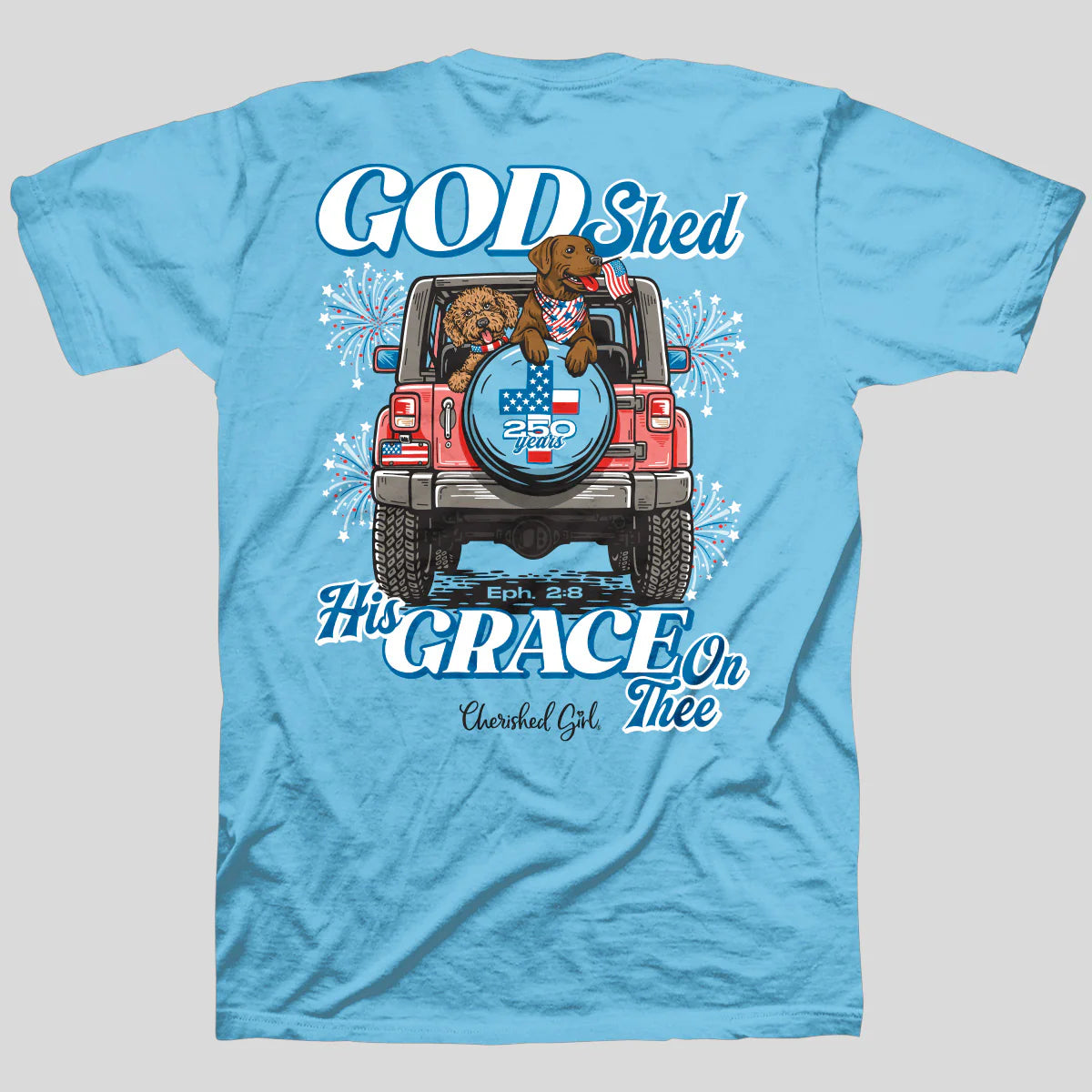 Celebrate faith, freedom, and God’s amazing grace with the “God Shed His Grace” Cherished Girl® T-shirt. Featuring a charming illustration of a pup riding in a vintage jeep surrounded by patriotic details, this sky-blue tee brings a joyful Americana feel to a powerful truth. Inspired by Ephesians 2:8, the message reminds us that grace is a gift—freely given and worth celebrating.