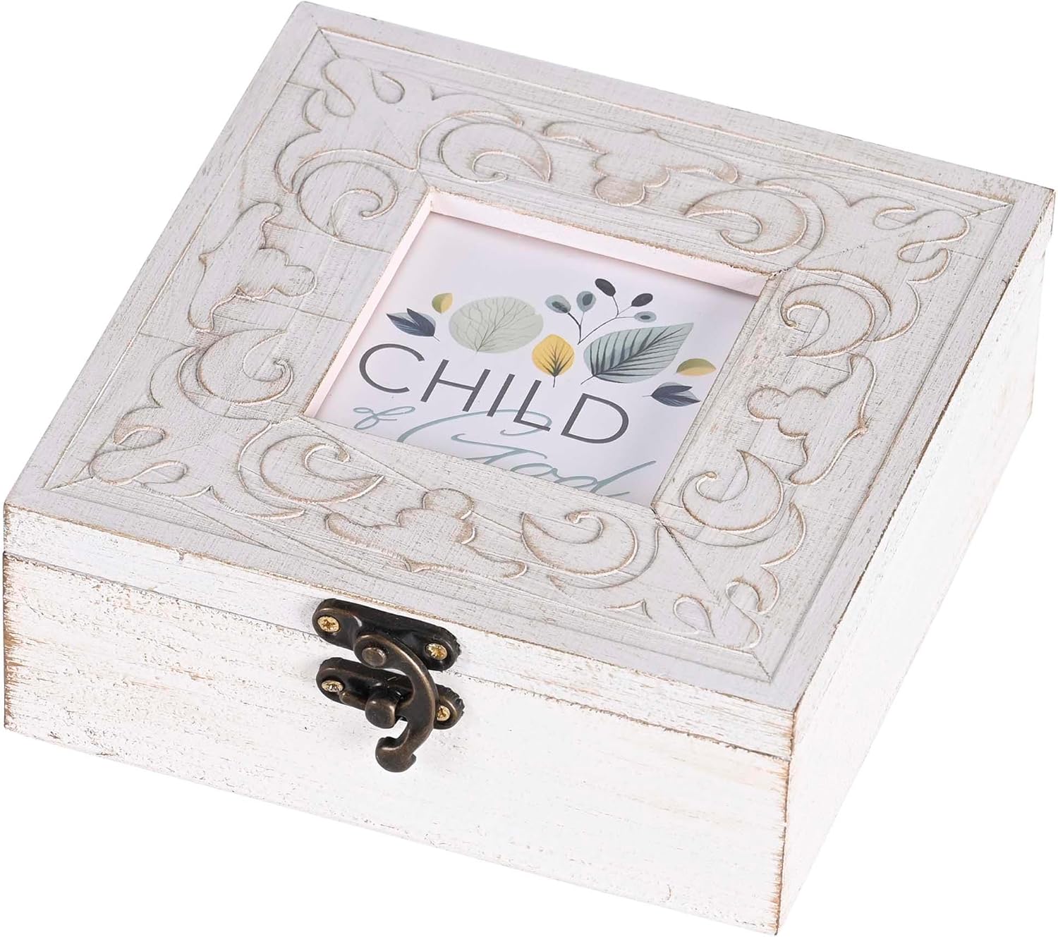 Child Of God - Teal Leaf Design - 6 x 6 x 2.25 Inch Distressed White MDF Wood Petite Musical Jewelry Box Plays Amazing Grace