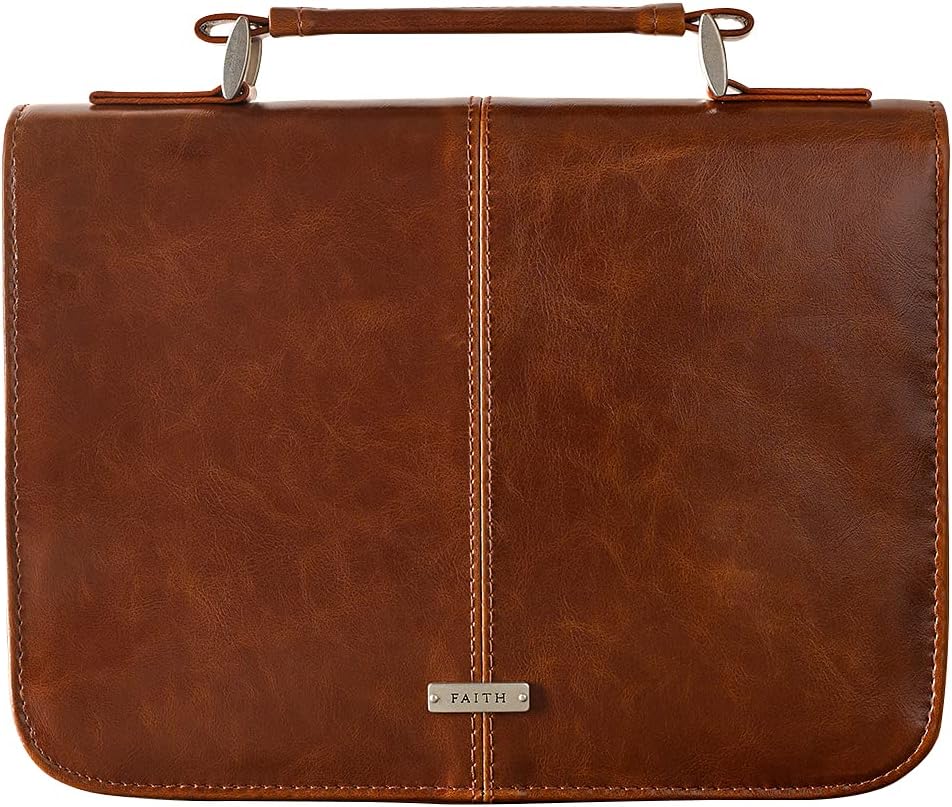- Scripture Bible Case: This handsome brown case features distressed faux leather with a metal badge with the word “Faith” engraved onto it and fastened with two metal riv