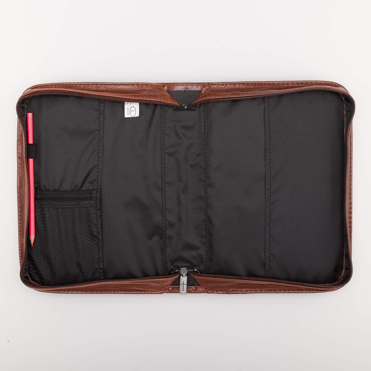 - Secure Zipper Closure: Ensures your Bible stays clean and safe inside. Exterior slip pocket provides extra space for organization. Slip your loose notes, bulletins, or tissues inside for easy storage.