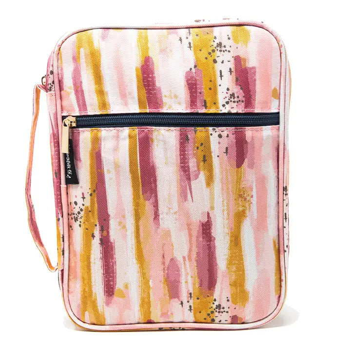 Details: - sized at 9"x10" (will fit most bibles) - cloth fabric (designed by the owner of Kingfolk Co) - easy wipe liner - inside pockets for notebooks + pens - elastic pen holder on right side of liner - exterior handle - front zipper pouch