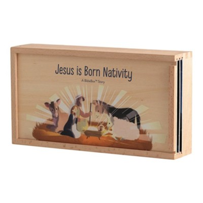 Jesus is Born Bible story box features wood box with two reversible slide out story panels and five character wood pieces. All pieces can be stored inside the box for convenience. 6" x 11" x 2"; wood composite board; wipe clean with cloth.