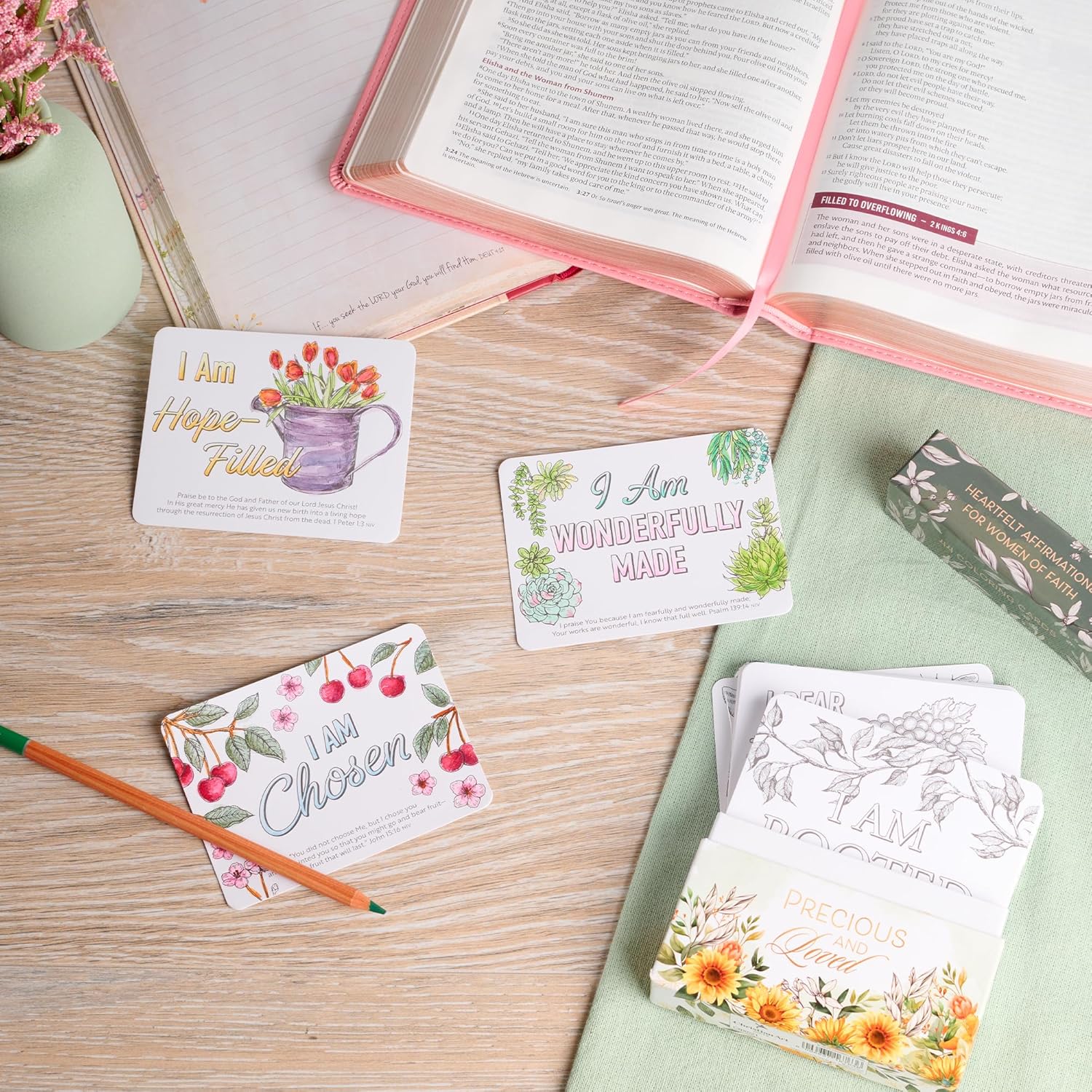 The box holds 44 cardstock cards that each feature a line-art illustration paired with a biblical affirmation and Scripture verse. The line-art illustrations are ready to be colored while reflecting on the Scripture they represent. The backs of the cards are left blank for you to add your own illustrations or insights.