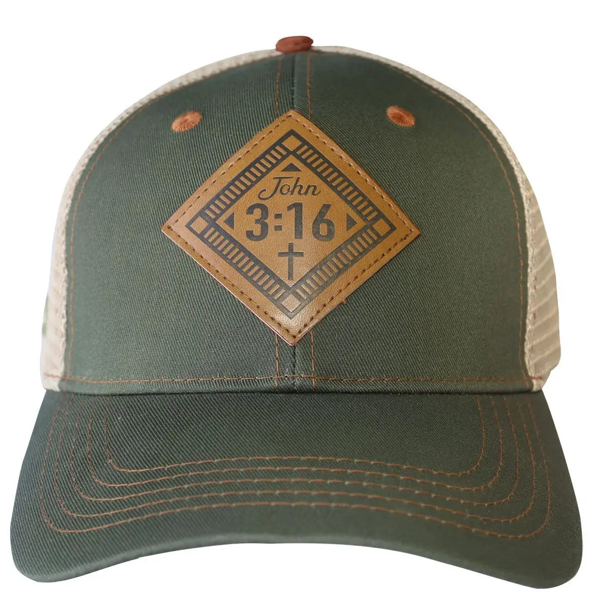 Share your faith in the Lord in this handsome “John 3:16 Leather” Cap by Kerusso® in Military Green/Tan with topstitch detailing. Eternal life is a concept our human brains can only scratch the surface of, but God loves us so much, He sent Jesus to die on the cross in exchange for our sins. We have hope and a future because God loved us enough to save us, paying an incredible price in the process.