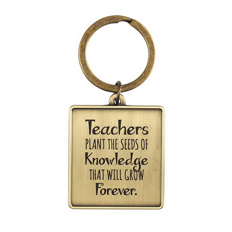 Antique Gold Finish Keyring; Rectangular Metal Keyring Tag Features Text: Teachers Plant The Seeds Of Knowledge That Will Grow Forever; Back Has Proverbs 22:6: Train Children In The Way They Should Go; When They Grow Old, They Will Not Depart From It. Tag Width Is 1 3/8In, Height Is 3In.