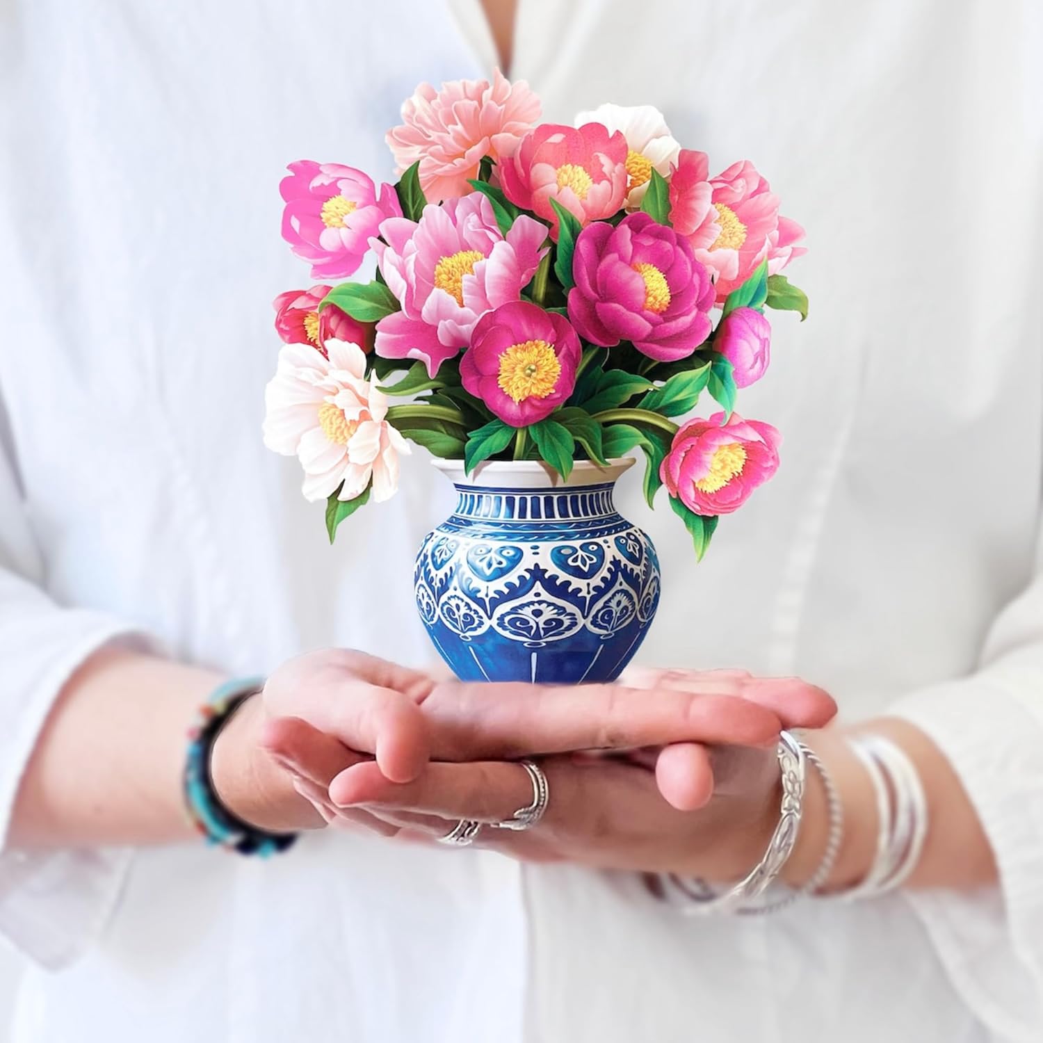 Make a big statement with our Mini Peony Paradise! Featuring a delightful assortment of rich pink hues in paper peony blossoms, this bouquet includes an indigo and white patterned pot and a matching blank notecard. Symbolic of bliss and beauty, it's perfect for wowing your loved ones with classic sentiments of love and well wishes. Each bouquet comes with a coordinating 2.5" x 3.5" blank note card and vibrant mailing envelope.