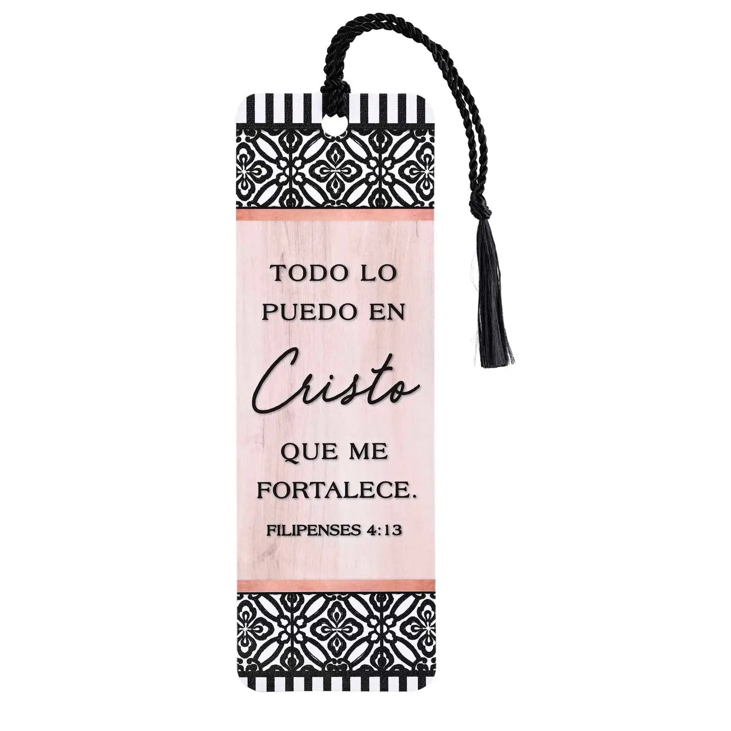 Tassel Bookmark Featuring Filipenses 4:13. This Bookmark Is Designed With A Black Tassel And Is Written In Spanish. Crafted From Paper With A Tassel In Black And Brown Hues. Words Read: Todo Lo Puedo En Cristo Que Me Fortalece. Each Bookmark Measures 2" X 6".