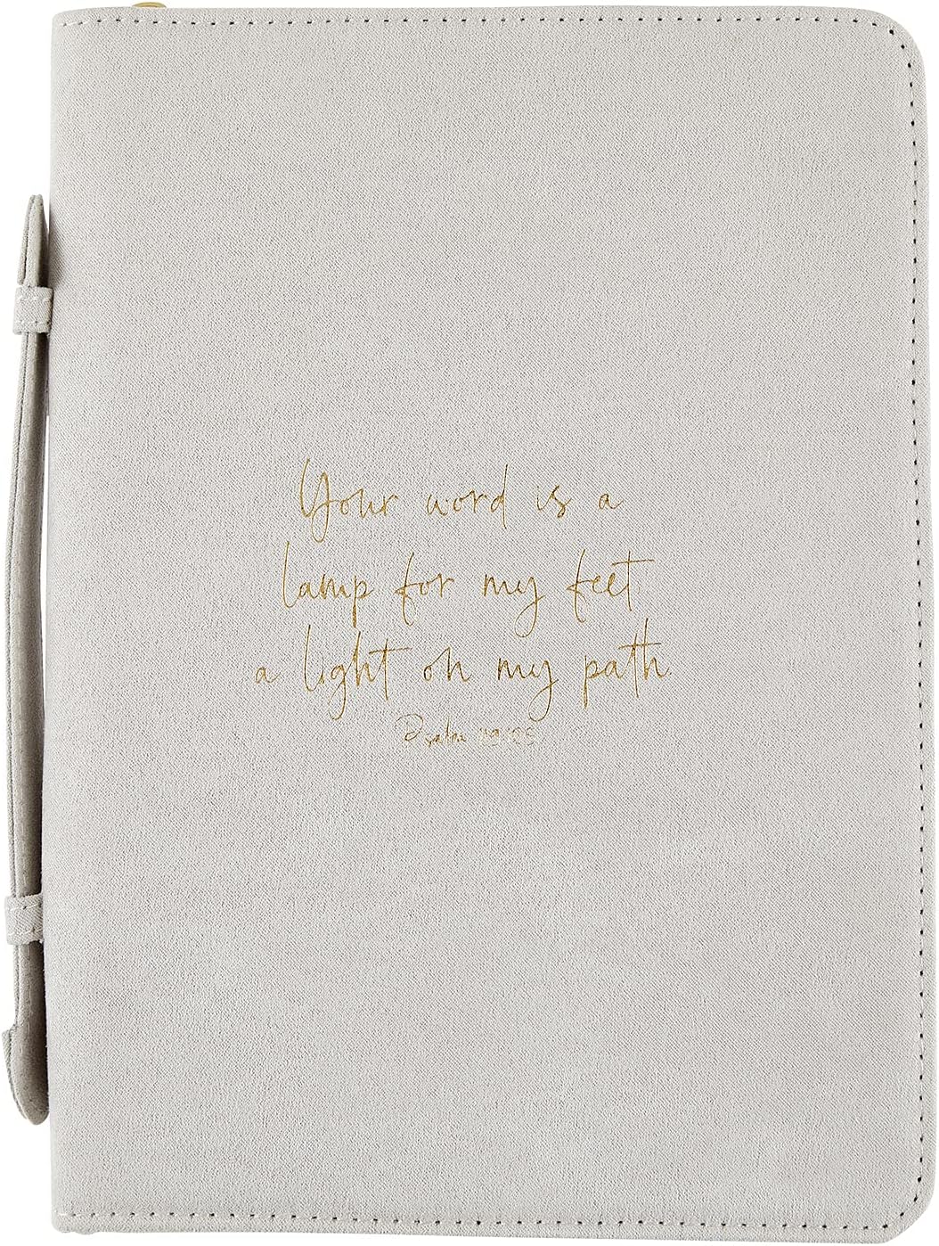 - GREY COVER WITH GOLD ZIPPER: Gold foil print reads "Your word is a lamp for my feet, a light on my path - Psalm 119:105"